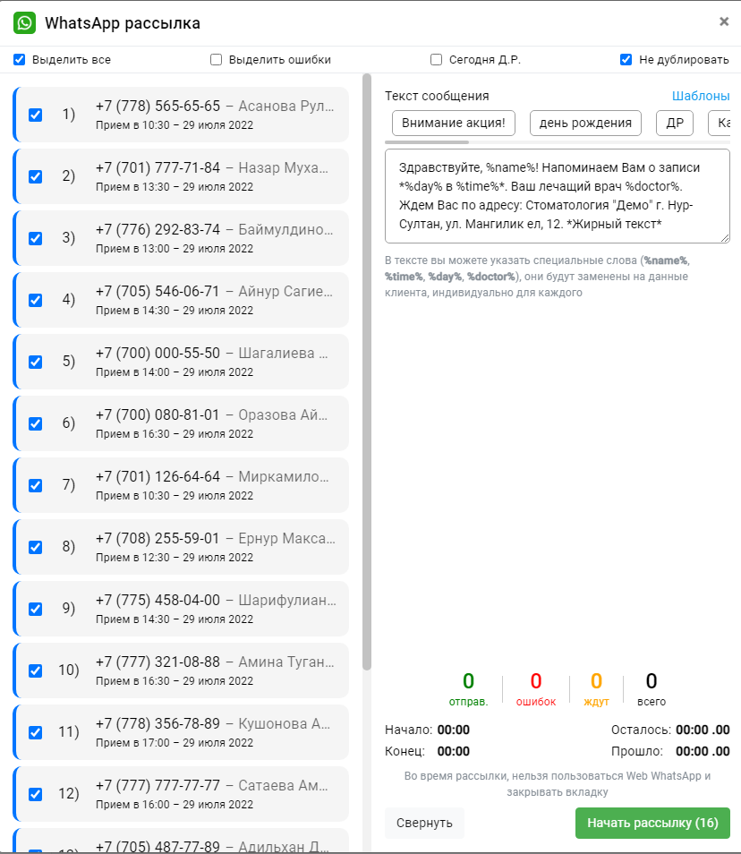 Автоматическое напоминание о первичном приеме через SMS или Whatsapp